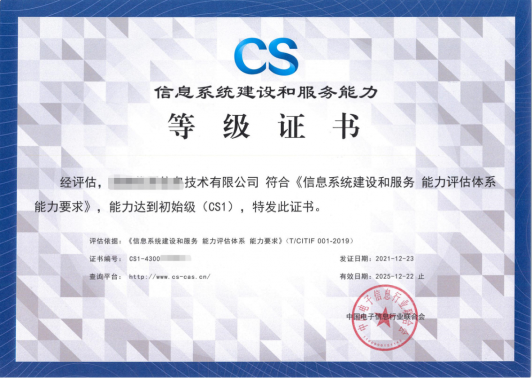 信息系统建设和能力评估资质分为五个等级,等级从低到高分别为CS1级(初始级)、CS2级(基本级)、CS3级(良好级)、CS4级(优秀级)、CS5级(杰出级)。证书四年有效,企业初次申请,不得高于CS2级,之后可逐级申请,不可跨级。