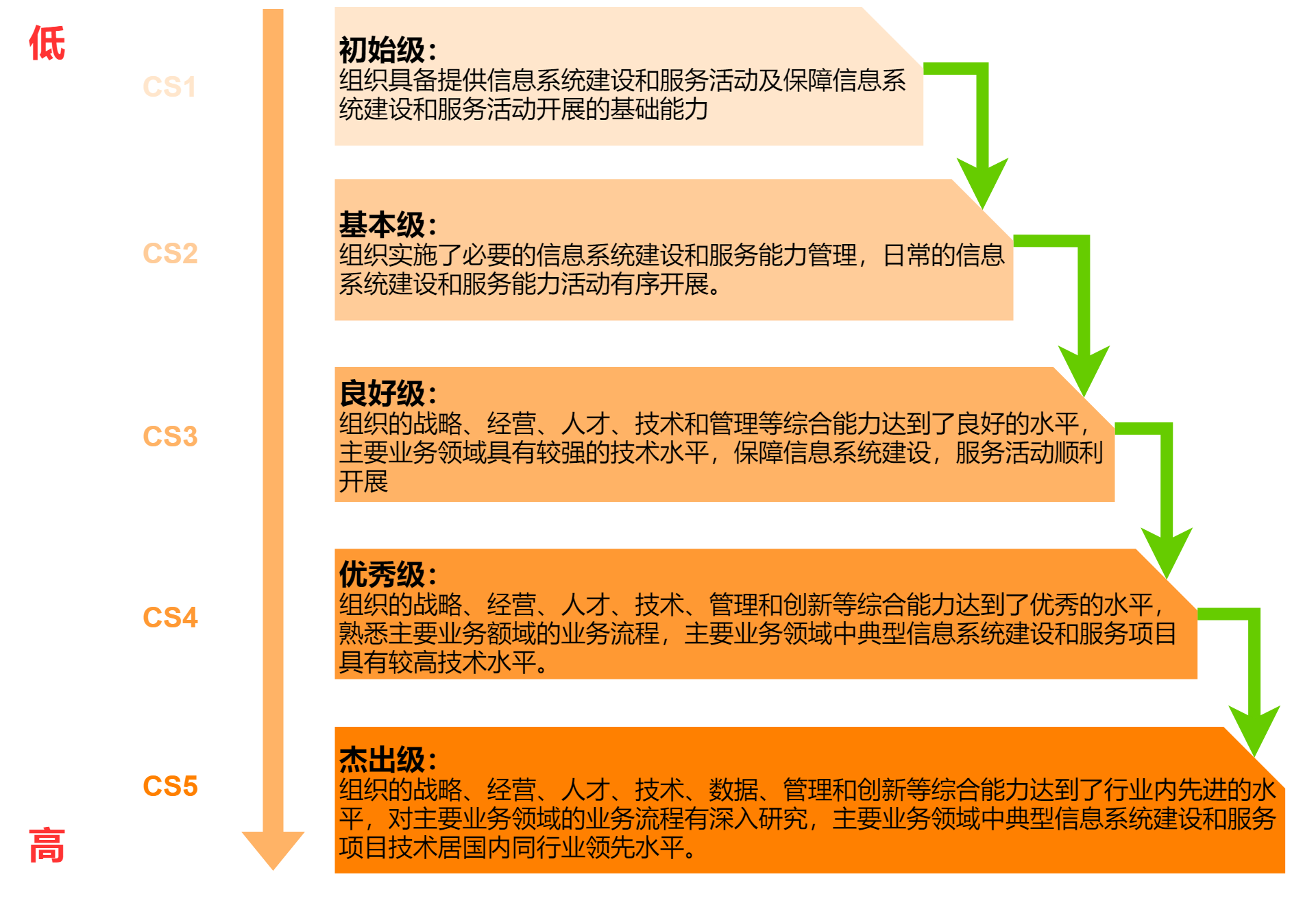 信息系统建设和能力评估资质分为五个等级,等级从低到高分别为CS1级(初始级)、CS2级(基本级)、CS3级(良好级)、CS4级(优秀级)、CS5级(杰出级)。证书四年有效,企业初次申请,不得高于CS2级,之后可逐级申请,不可跨级。
